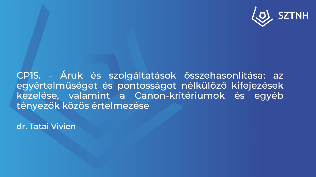 A második előadás az EUIPO Konvergencia Programjának CP15. számú, az áruk és szolgáltatások összehasonlítása: az egyértelműséget és pontosságot nélkülöző kifejezések kezelése, valamint a Canon-kritériumok és egyéb tényezők közös értelmezéséről szóló, a Hivatal által 2025. május 1-től – az implementáció időpontjában folyamatban lévő, valamint az azt követően induló védjegyeljárásokban egyaránt – alkalmazott közös gyakorlat ismertetésével foglalkozott.