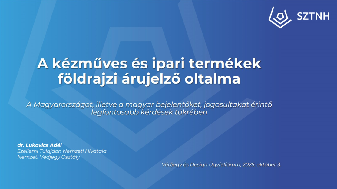 Az első előadás a kézműves és ipari termékek földrajzi árujelző oltalmával foglalkozott. A téma aktualitását az adta, hogy 2025. december 1-től e termékek megnevezéseit illetően kizárólag európai uniós földrajzi árujelző oltalom igényelhető. Az előadó a főbb irányadó jogszabályok (ideértve a vonatkozó európai uniós rendeletet is) bemutatását követően összegezte az európai uniós oltalom megszerzésével kapcsolatos lényegi és gyakorlati tudnivalókat. Többek között kiemelte, hogy az oltalomszerzés az új rendszerben e gy nemzeti és egy uniós szakaszban történik majd, a nemzeti szakasz lefolytatásáért a Hivatal, az uniós szakaszért pedig az Európai Unió Szellemi Tulajdoni Hivatala (EUIPO) lesz felelős.